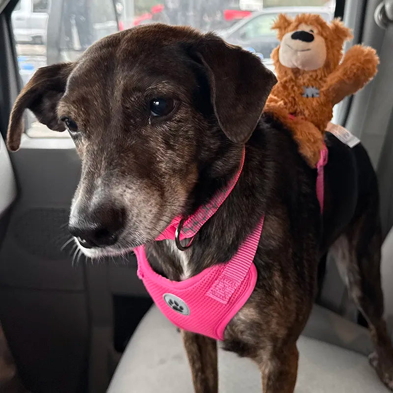 Moonpie was one of the dogs Steve-O took for a โtest driveโ on his tour bus during a visit to the Simpson County Animal Shelter in Franklin, Kentucky. It was so successful, he adopted her and brought her with him everywhere he traveled by bus and RV for almost two years. In December of 2025, though, when it was time for the bus to leave the Radical Ranch, she chose to stay with her new boyfriend, Keanu. Now she lives permanently at the ranch, where she loves to play with Keanu every day.ย
