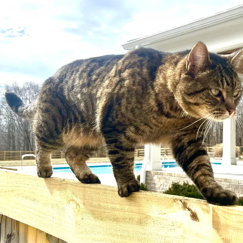 Winifred was an itsy bitsy kitten when Steve-O found her at the South Los Angeles Animal Shelter in 2016. She was so affectionate, he knew he had to adopt her. Now, almost ten years later, Winnie is primarily an indoor cat, supervising the household at the radical Ranch, and still affectionate as ever! ย
